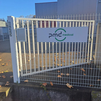 Dès l’arrivée sur le site, l’identité de PMD Médical s’impose avec clarté et modernité. Nous avons conçu et fabriqué une signalétique extérieure complète, incluant un panneau d’entrée sur grillage, deux grandes enseignes sur les façades et des visuels dynamiques sur les portes d'accés du bâtiment. Chaque élément a été réalisé dans notre atelier de Caissargues, à quelques minutes de Nîmes, en utilisant des matériaux résistants (adhésif polymère) et des techniques d’impression haute qualité. La pose, effectuée par notre équipe, a été adaptée aux spécificités du site : fixation sur grillage, mur lisse de bardage architectural, avec une attention particulière portée à l’alignement et à la visibilité.